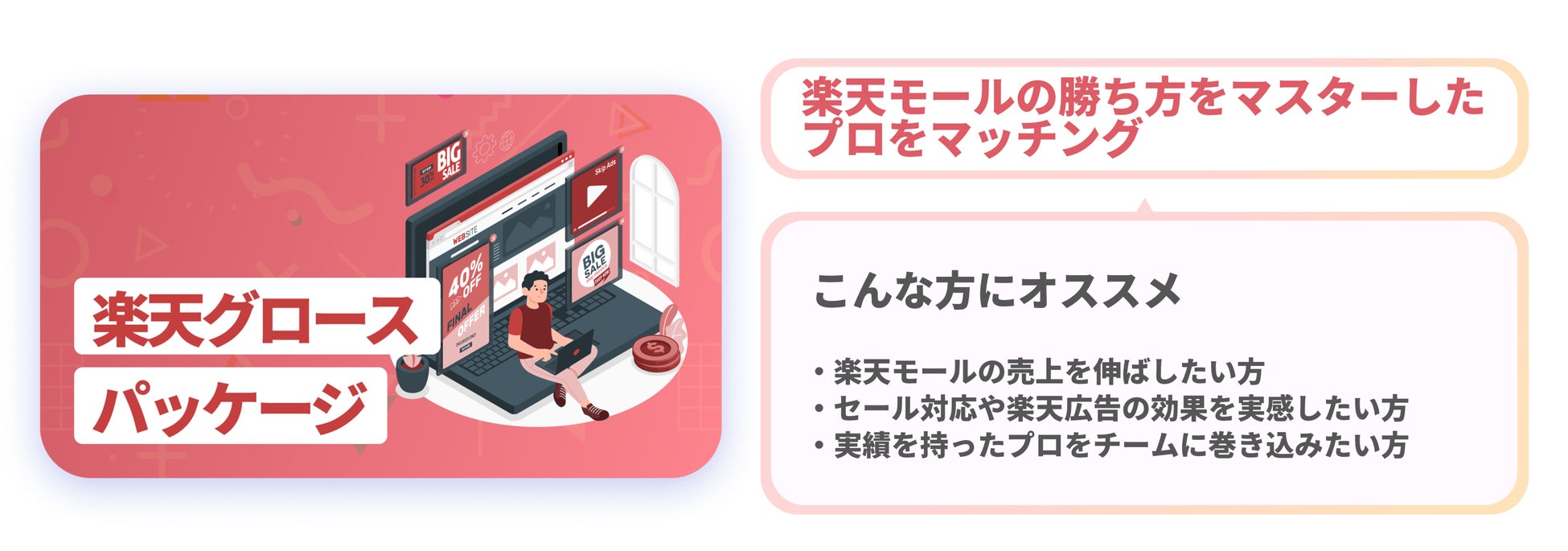 楽天の運用実績が豊富なプロをマッチングして、新規集客からリピート支援まで、EC事業主様の状況に合わせた並走支援を行います。