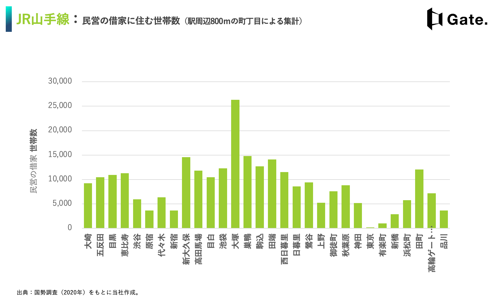 いずれのデータも駅から直線距離で800m以内(おおむね徒歩10分圏内)の「民営の借家」に住む世帯数を、丁目単位で集計しております。