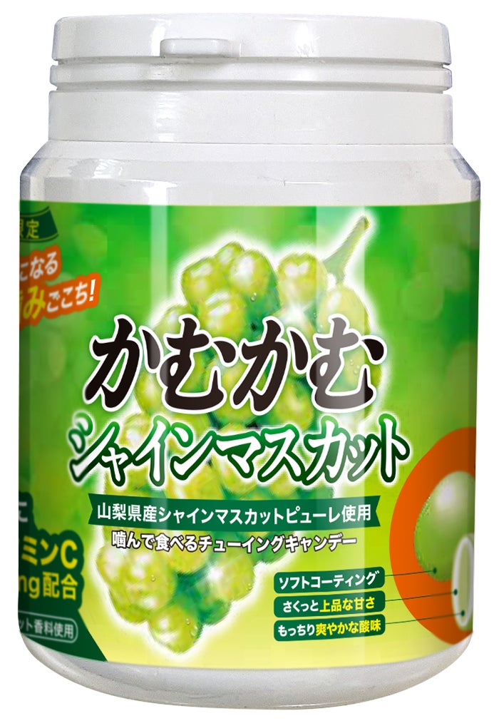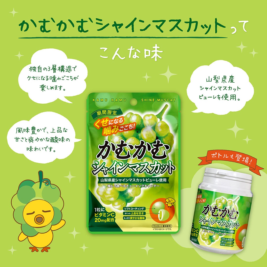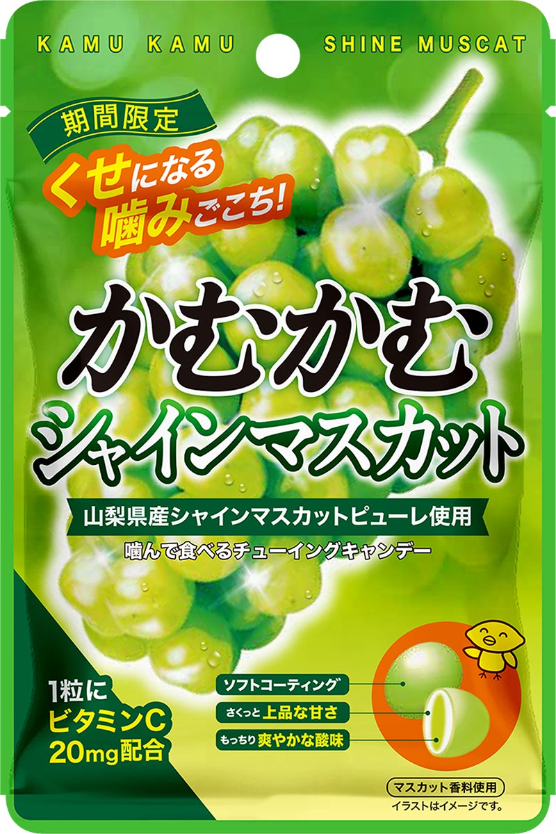 昨年まで販売していたかむかむシリーズの中でマスカット味は人気なフレーバーの為、山梨県産のシャインマスカットピューレを使用し、更にグレードアップした味わいで新発売致します。