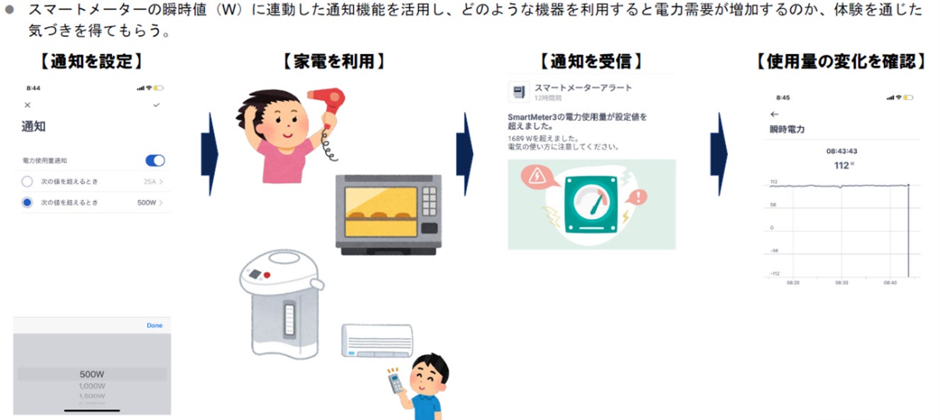 また、事前・事後アンケート調査により、省エネ・節電等に対する参加者の興味や行動変化の分析を行います。これらのデータを活用し、将来の地域脱炭素化に向けた有効策についても検証してまいります。なおHEMSのクラウドサービス機能により、各世帯における直近電力使用量の推移からの節電効果も併せて分析・フィードバックする予定です。