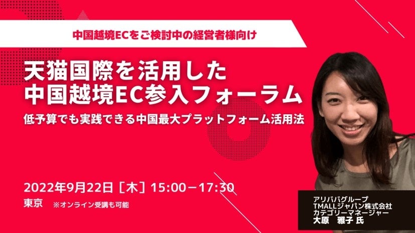 今回の業務連携を推進する目的で、2022年9月22日(木)に当社主催で、アリババグループ Tmallジャパン株式会社のカテゴリーマネージャーである大原雅子氏をお迎えし、「天猫国際」の具体的な仕組みと越境ビジネスにおけるビジネスチャンスをお伝えするセミナ―を株式会社船井総合研究所 丸の内セミナールームにて開催します。