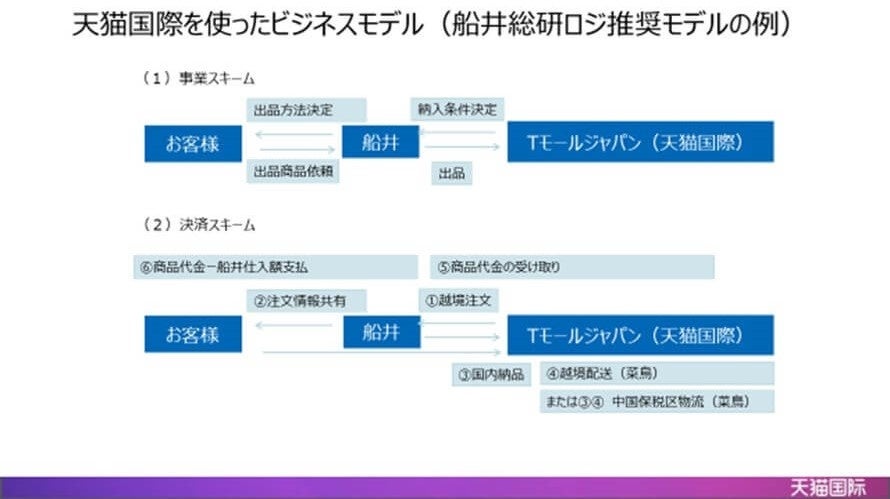 これまでは「天猫国際」に旗艦店出店すると、中国側の運営会社に委託する運営費用や、月次で発生する各種広告費用、ライブコマース費用など初期段階で多額の先行投資が必要となっておりました。今回、船井総研ロジが推奨する「天猫国際」モデルにおいては、従来より少額の投資で中国越境EC市場に自社商品が掲載され販売できるビジネスモデルとなっております。有名ブランド以外、特に、中国でまだ知名度のない中小企業にとっては利用しやすいビジネスモデルです。