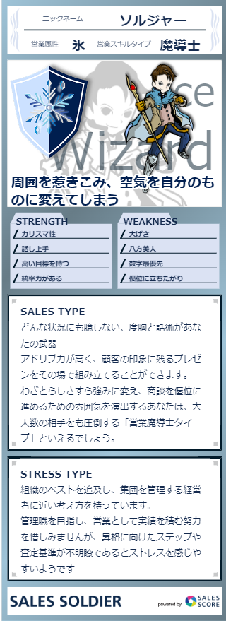ユーザーは5つの戦士タイプと8つの属性に分類され、適した営業スタイルと活躍できる環境が明らかになります。