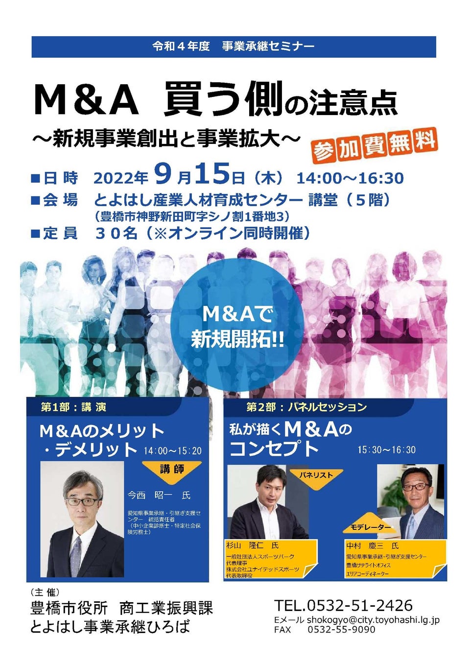 愛知県豊橋市は9月15日(木)、M&Aの買い手側に立った内容の事業承継セミナーを開催します。新規事業に参入したい中小企業や小規模事業者の経営者、創業希望者が対象です。