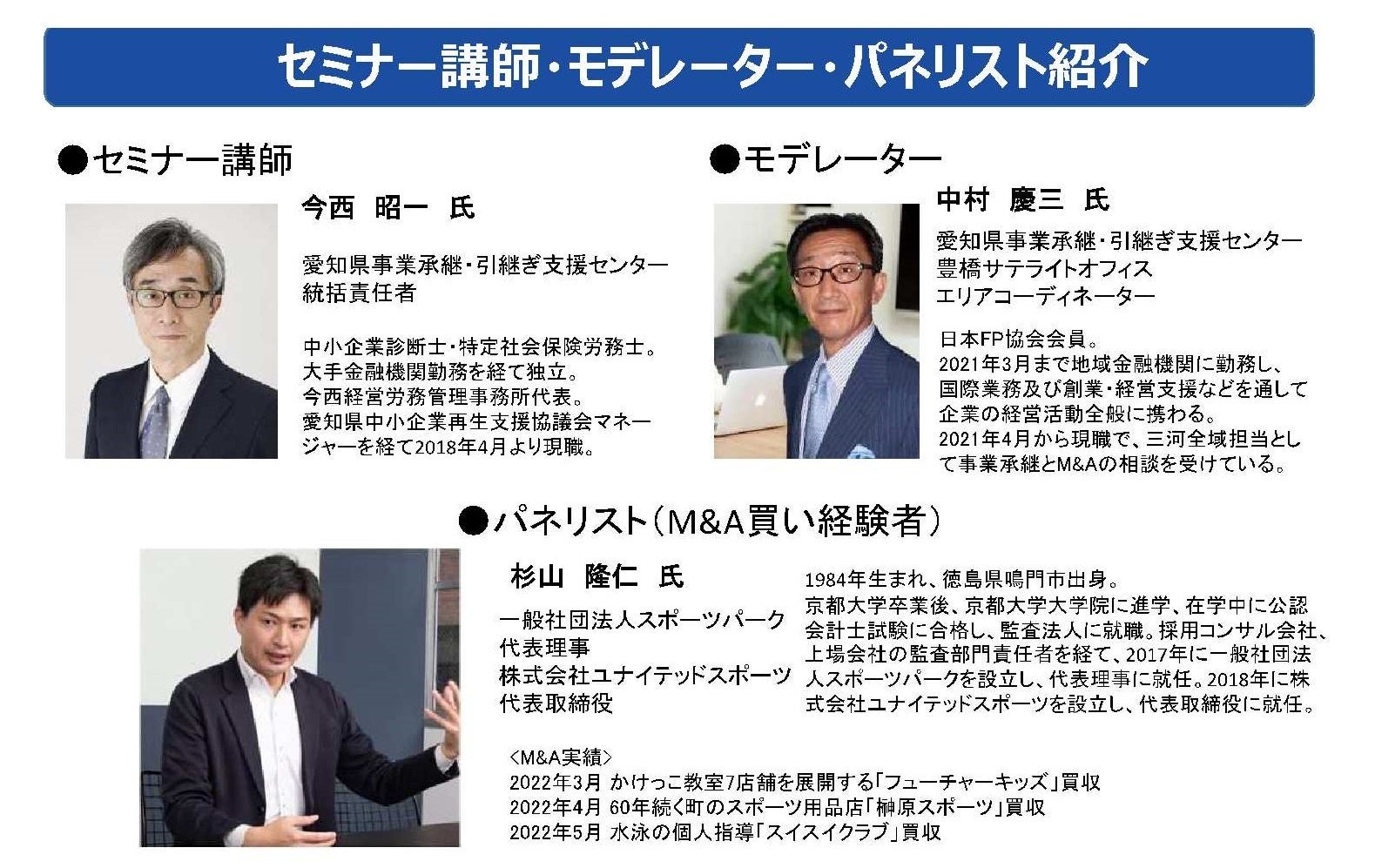 愛知県事業承継・引継ぎ支援センター豊橋サテライトオフィスエリアコーディネーターの中村慶三氏が、モデレーターを務めます。