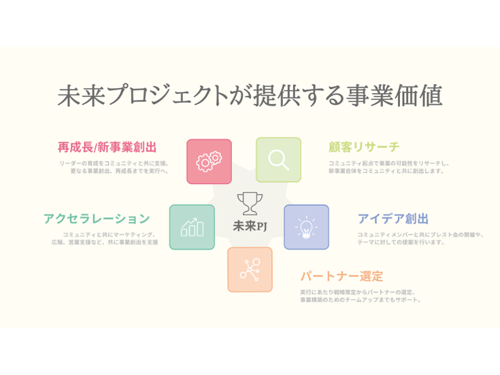 - 未来パートナー:個人で、共に事業を作ったり、プロジェクトを進めていく方々。