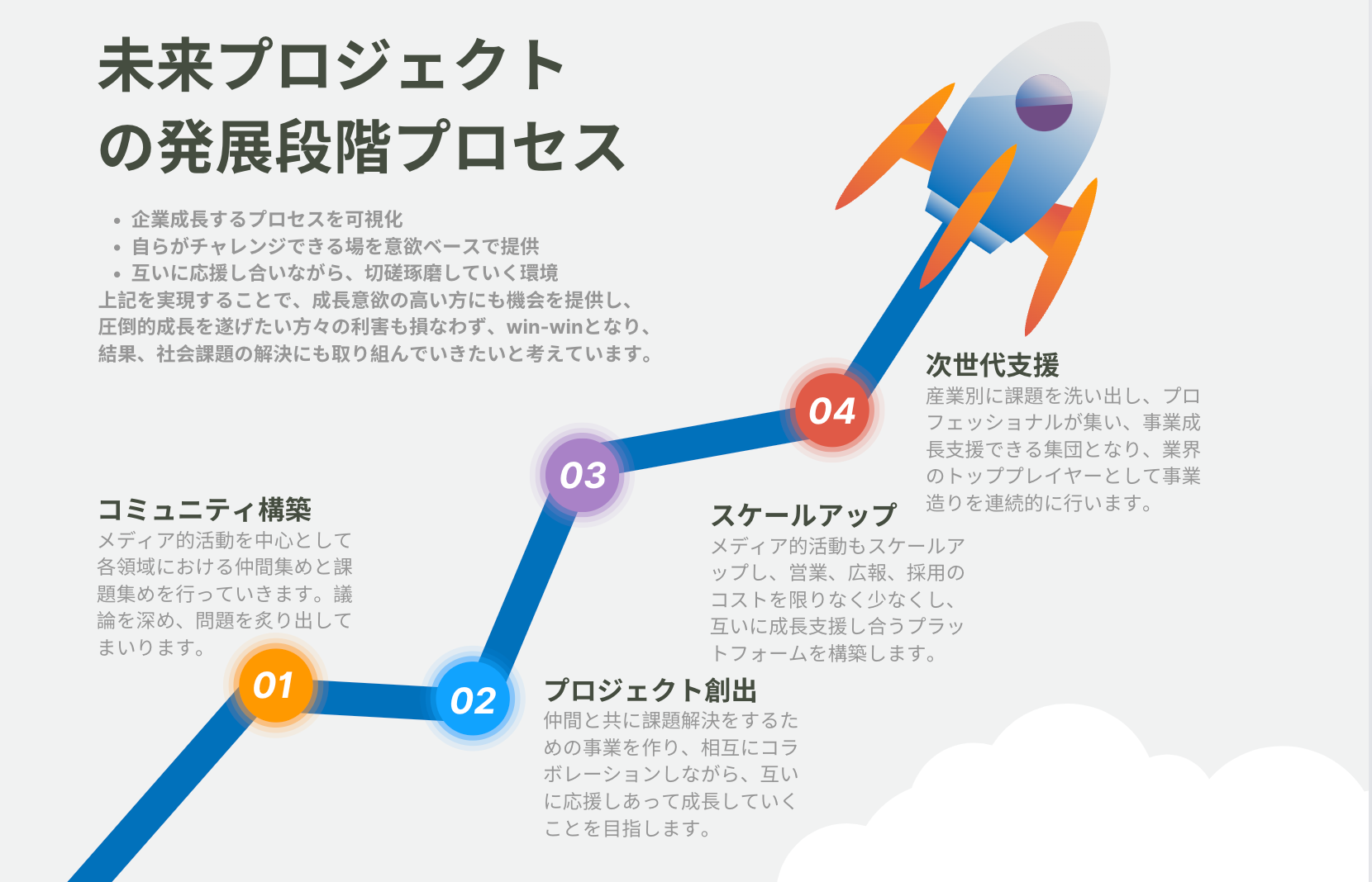 それを形にしようとしたのが、今回の未来プロジェクトでもあります。会社にする必要があるのか、といった問いもあります。ただ、メディアインキュベートが行うのはインキュベーション(https://prtimes.jp/main/html/rd/p/000000356.000018590.html)であって、今回のチャレンジは、イノベーションを連続的に生み出し続けるエコシステムの構築に注力しています。
