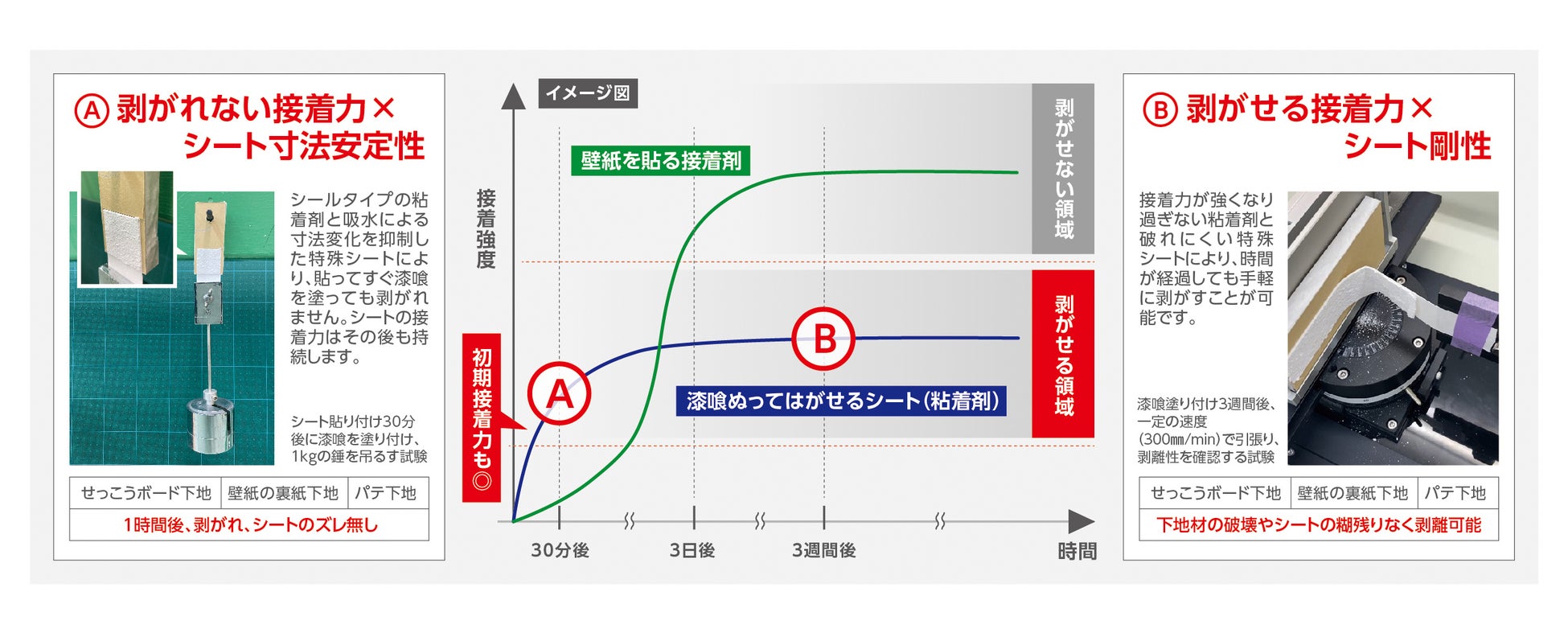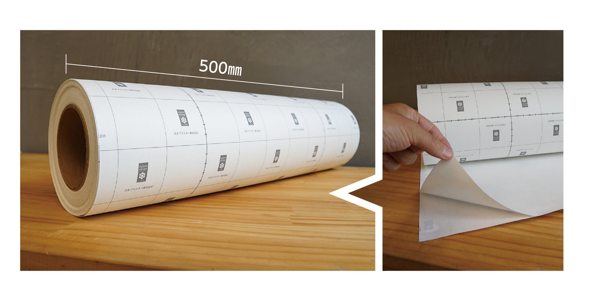 シールタイプの粘着剤と、吸水による寸法変化を抑制した特殊シートにより、貼ってすぐ漆喰を塗っても剥がれません。またシートの粘着力はその後も持続します。