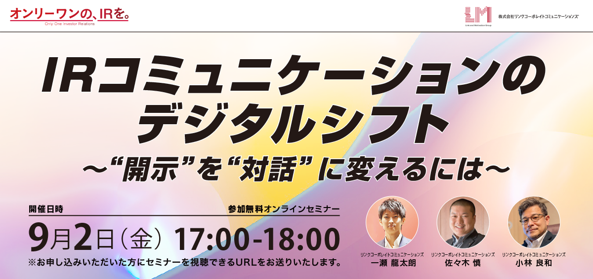 企業のIR領域を支援する株式会社リンクコーポレイトコミュニケーションズ(本社:東京都中央区 代表:白藤大仁)は、「IRコミュニケーションのデジタルシフト」をテーマに無料WEBセミナーを開催します。
