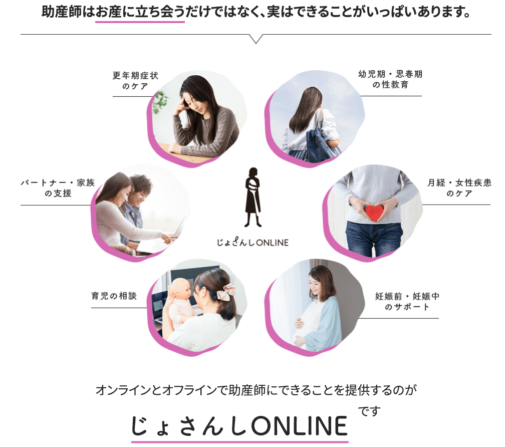 じょさんしONLINEでは、女性のライフイベントの専門家である助産師が、働きながら妊娠・出産・育児する女性の身体や心が健康でい続けられるために、オンラインで参加女性の妊娠・出産・育児に伴走します。