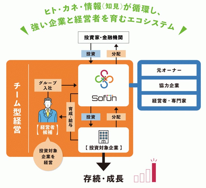 SoFun株式会社は「中小企業が再び輝く社会を作り、日本をおもしろくする。」をビジョンとして、若手経営者の発掘と事業承継型投資(永続保有を前提としたマジョリティ投資)を行うことにより、幅広い企業に「家業から事業への変革」による再成長の機会を提供しています。
