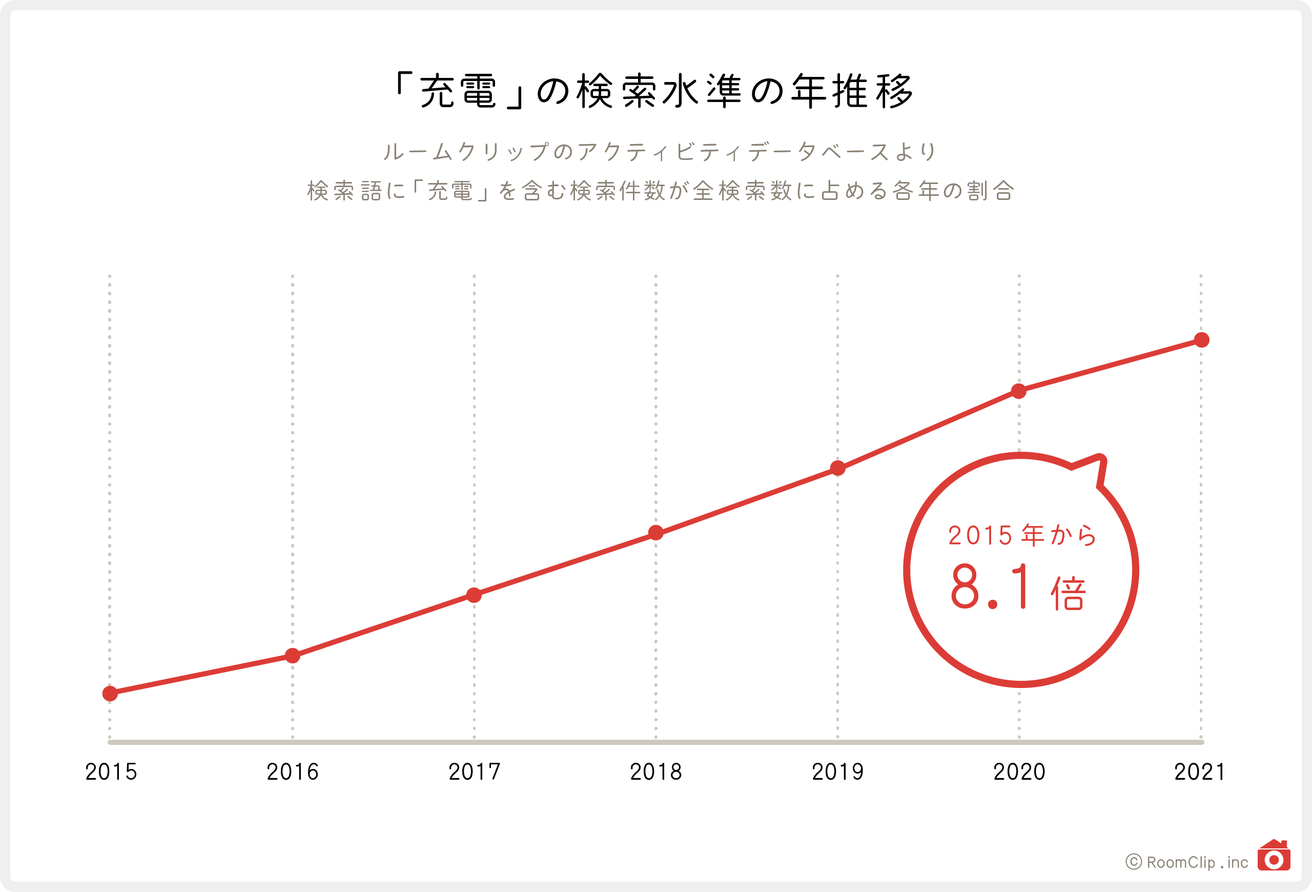 上のグラフは、RoomClipで「充電」という単語を含むキーワードの検索数が、各年の全検索数に対してどの程度の割合があったかを示すものです。結果は、一時的なピークを見せることもなく上昇が続いており、2015年と2021年の比では8.1倍にまで増加しています。