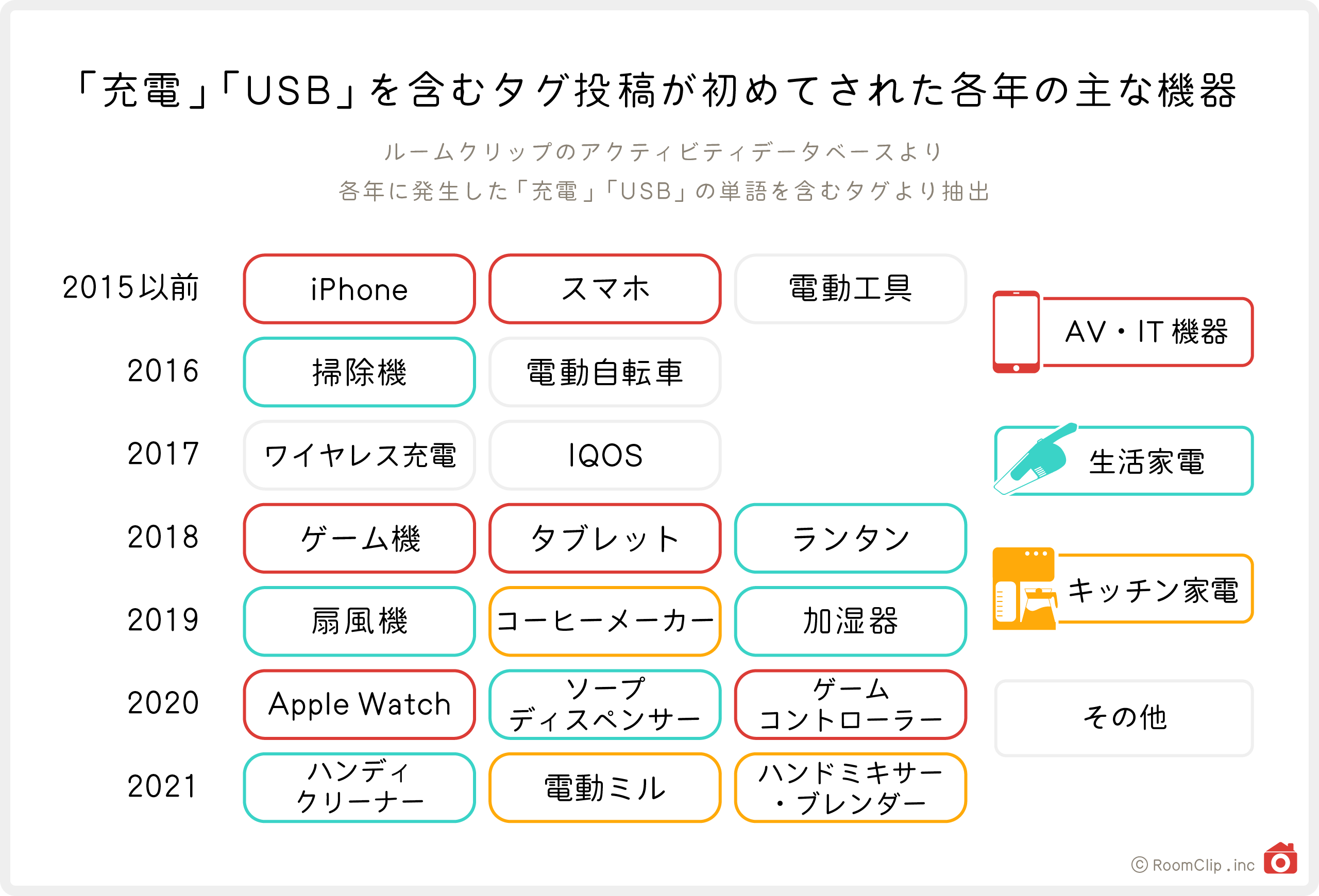 各年に発生したタグを元に、その年に関連した主な機器をピックアップすると、上図のようになります。2015年以前は、その後の多様化のキーとなるスマートフォンがまず登場しています。2016年には充電式のスティック型掃除機が人気となったことから、専用スタンドのDIY等が話題になったことも記憶に新しいところです。その後、2018年以降にはUSB充電を採用した多種多様な機器がRoomClipで充電の話題とともに投稿されています。