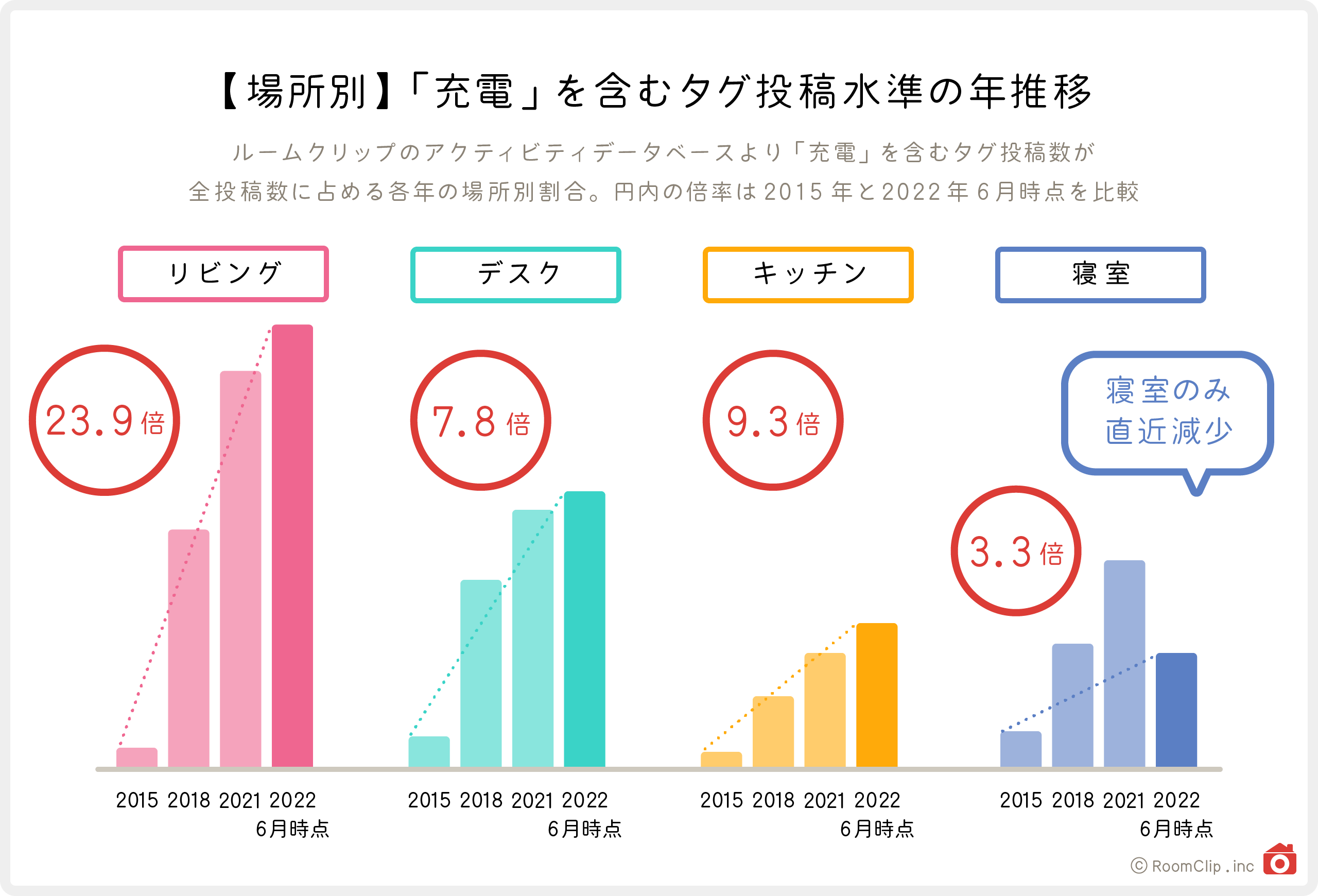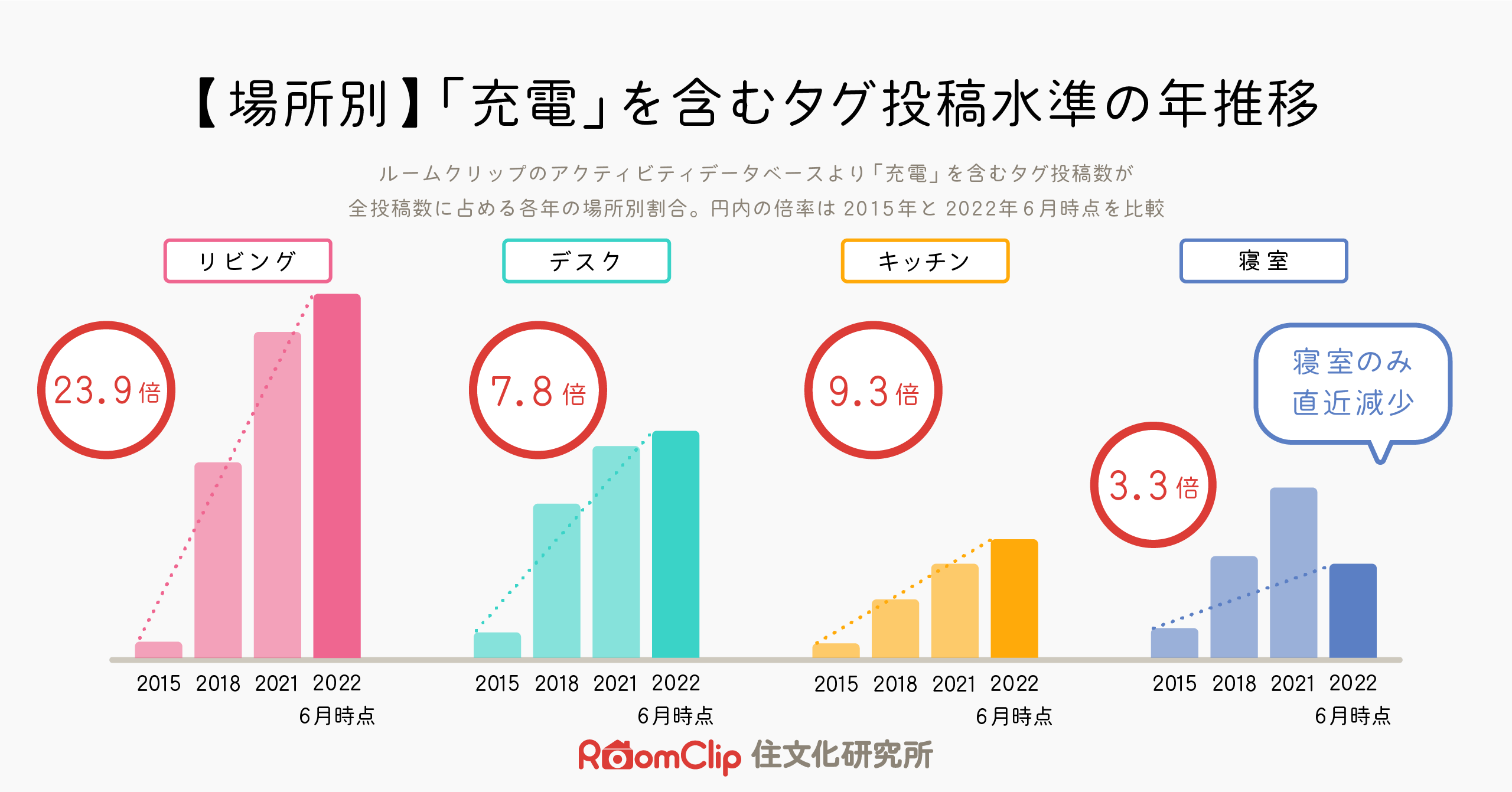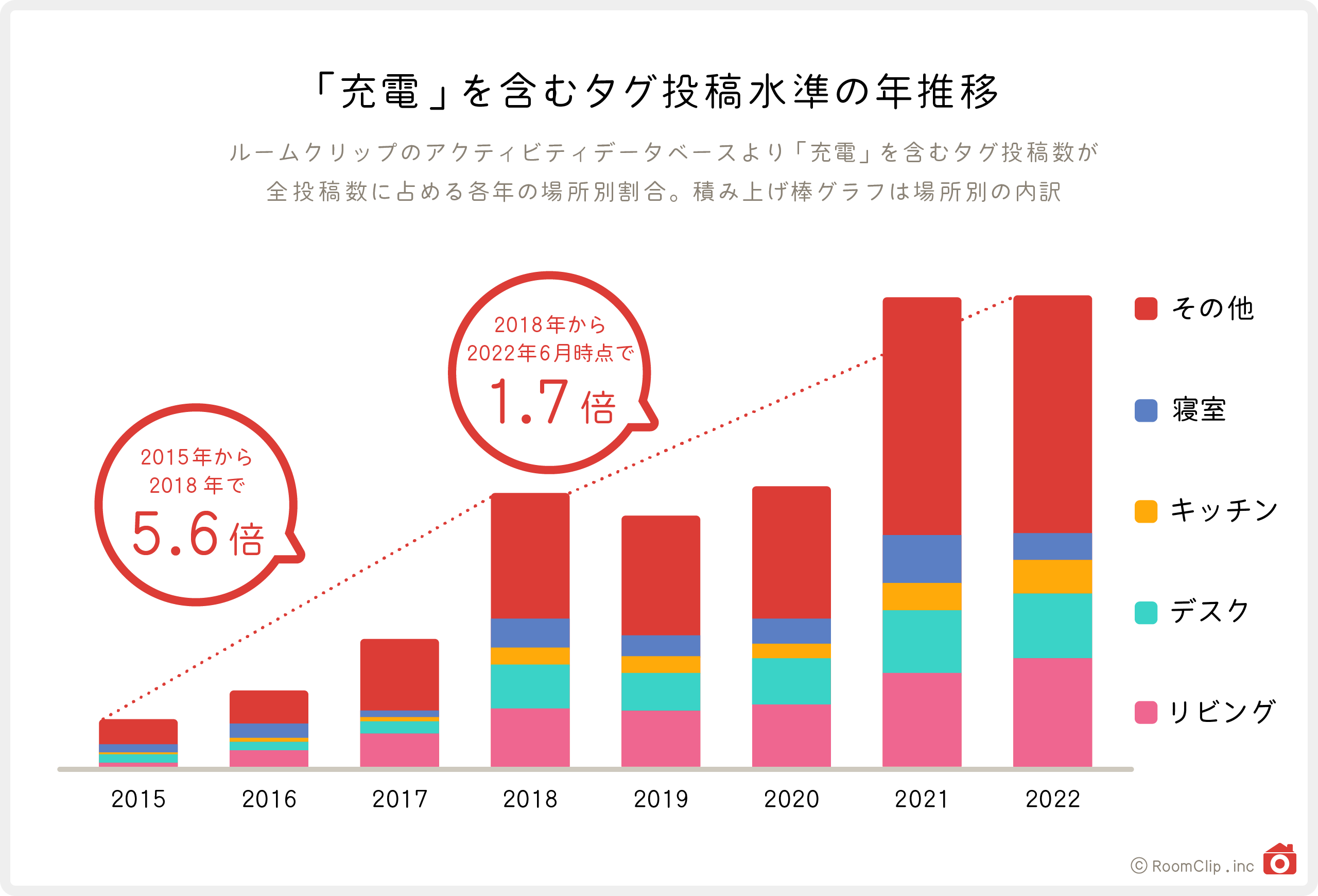 上図はRoomClipルームクリップで「充電」を含むタグが各年の全投稿数に対してどの程度投稿されたかの割合を示す投稿水準グラフです。