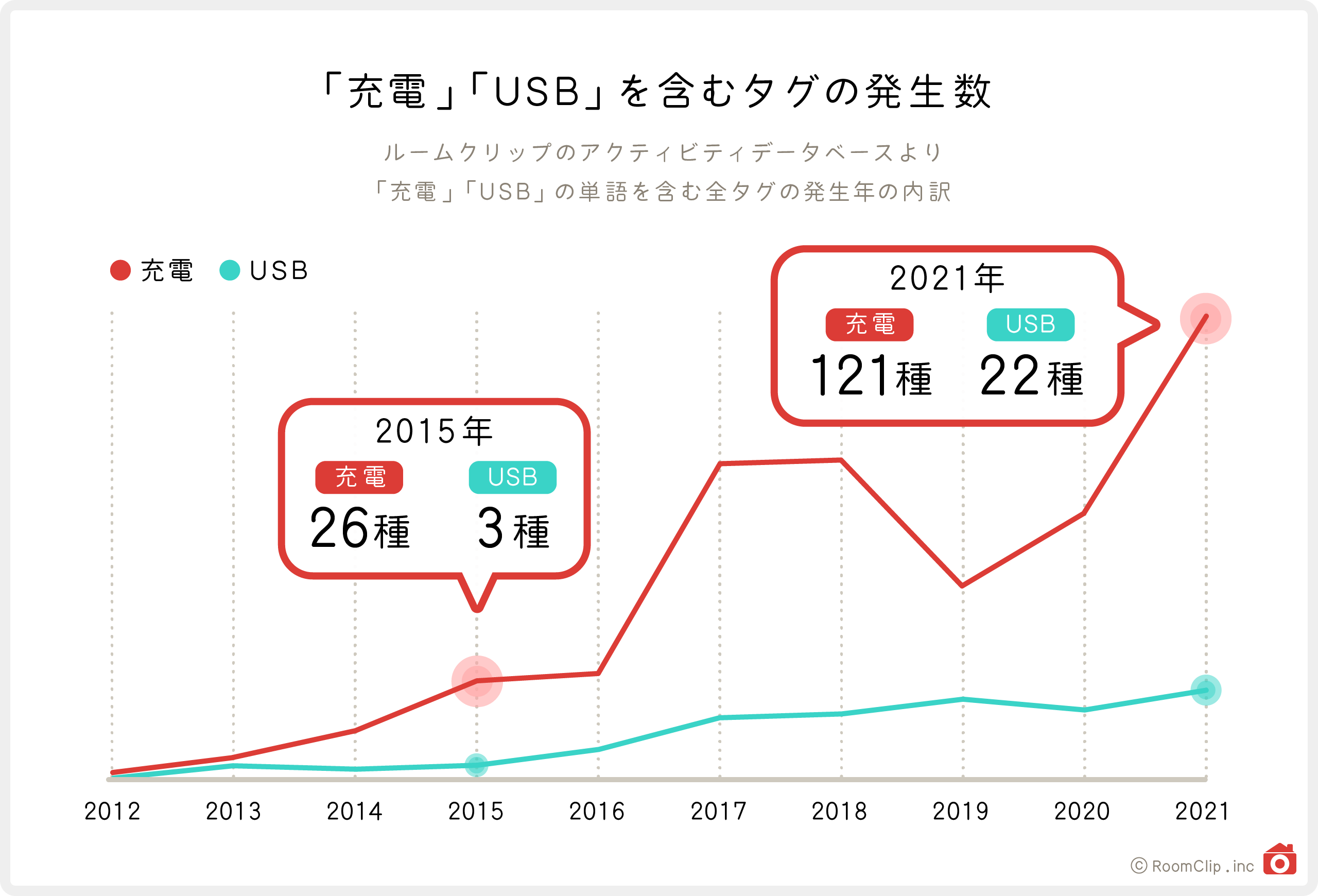 「充電」「USB」を含むタグの発生数の推移を見ると、サービス開始当初から年々新しいタグは増加傾向で、例えば2015年に生まれた「充電」「USB」を含む新種のタグは合計29種でしたが、2021年は144種。約5倍に増加し、今後も増加傾向にあると考えられます。