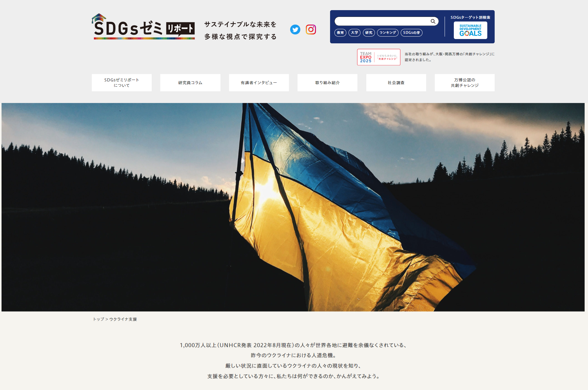社会貢献活動における「ウクライナ支援」は募金活動だけに留まらず、情報発信を通した支援活動を積極的に進めています。当社オウンドメディア「SDGsゼミリポート」を活用し、まずはウクライナの現状に目を向け、支援を必要としている方々のために一人ひとりが“できること”を考えるきっかけとなるコンテンツを制作。