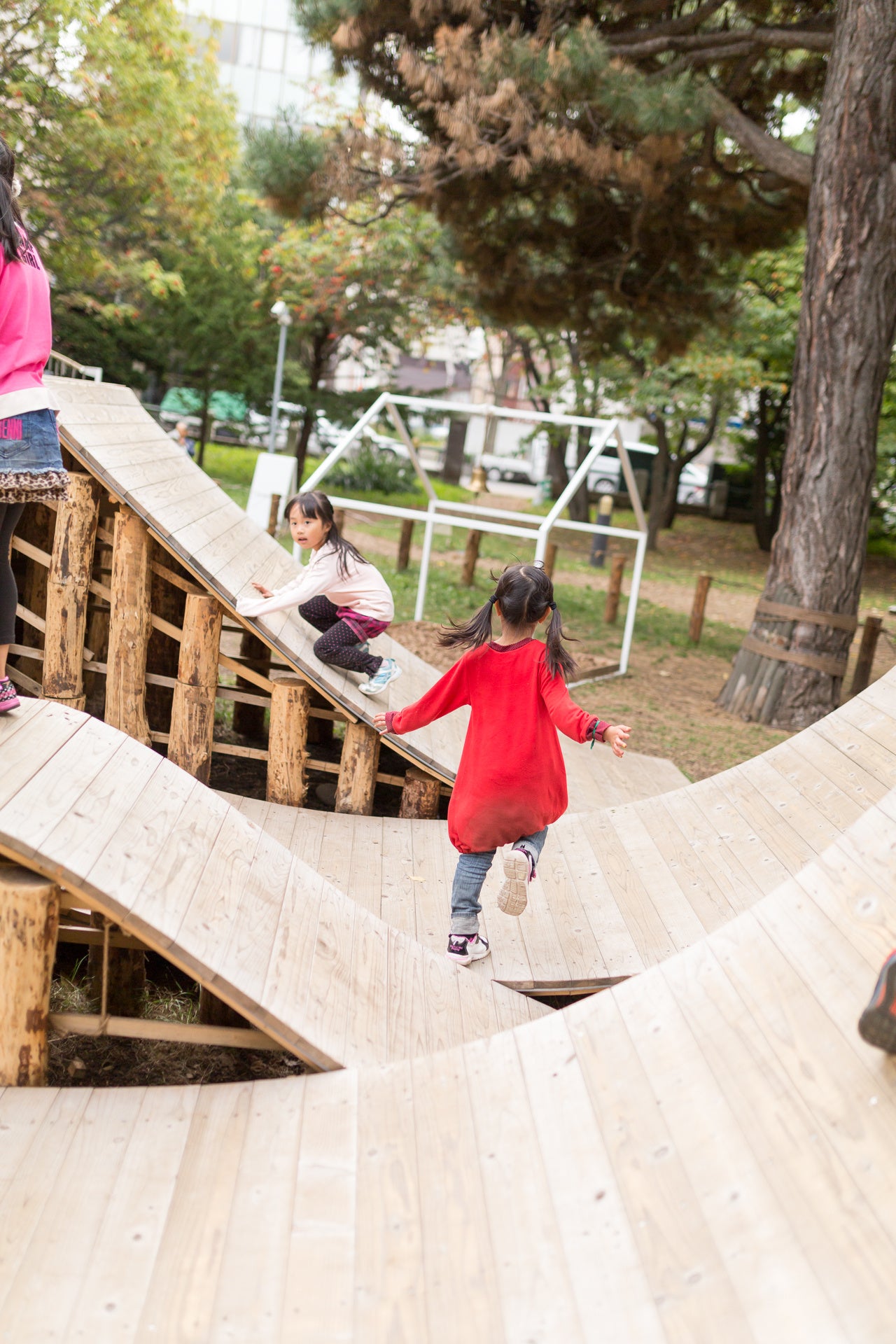 これからの学び場/遊び場のビジョンを提示する「コロガル公園」は、不定形な床とさまざまな仕かけで構成された公園型のインスタレーションです。子どもたちは、重力・速度・遠隔操作という遊びの根源的な喜びを感じながら、新しい動きや遊びのルールを生み出すことを誘発されます。