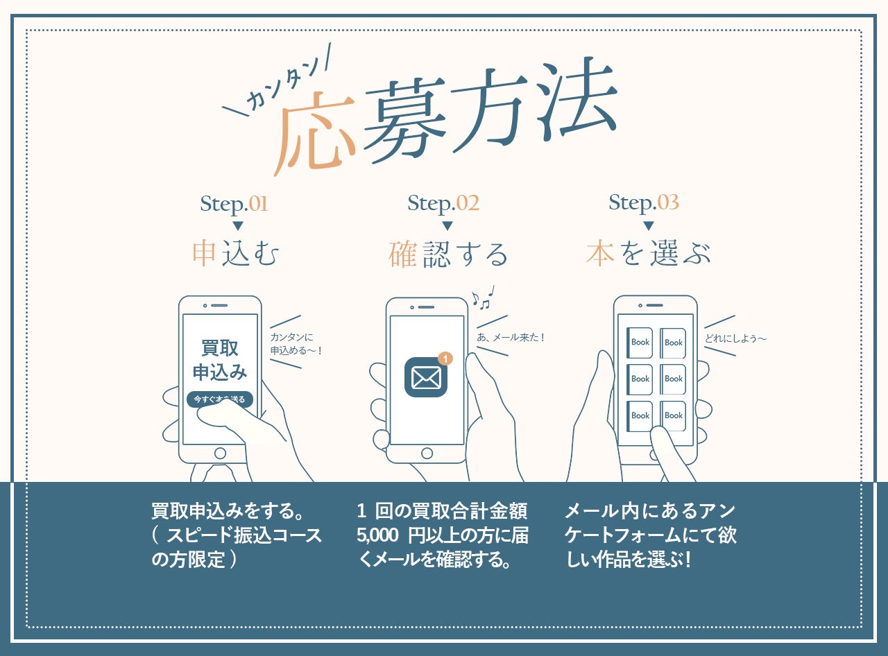 「話題の新刊本もれなく全員にプレゼントキャンペーン」はただ本のプレゼントがもらえるのではなく、宅配買取サービスを通して”町の書店を一緒に応援できる”ちょっと特別なプレゼント企画です。