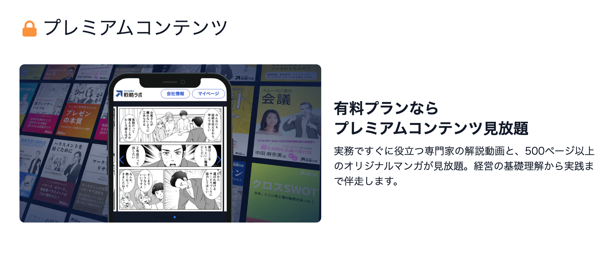 プレミアムコンテンツは、第一線で活動する中小企業実務の専門家による解説動画と500ページ以上におよぶマンガ、クイズがついた講座を指します。
