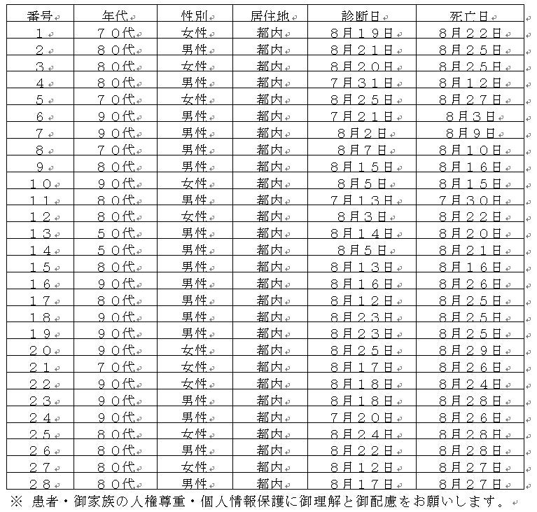 新型コロナウイルスに関連した患者の死亡について business Twitter Facebook はてブ Pocket LINE コピー 2022.09.01 この記事は約1分で読めます。 都内で新型コロナウイルスに感染した方が死亡されましたのでお知らせします。 お亡くなりになった方のご冥福をお祈り申し上げます。