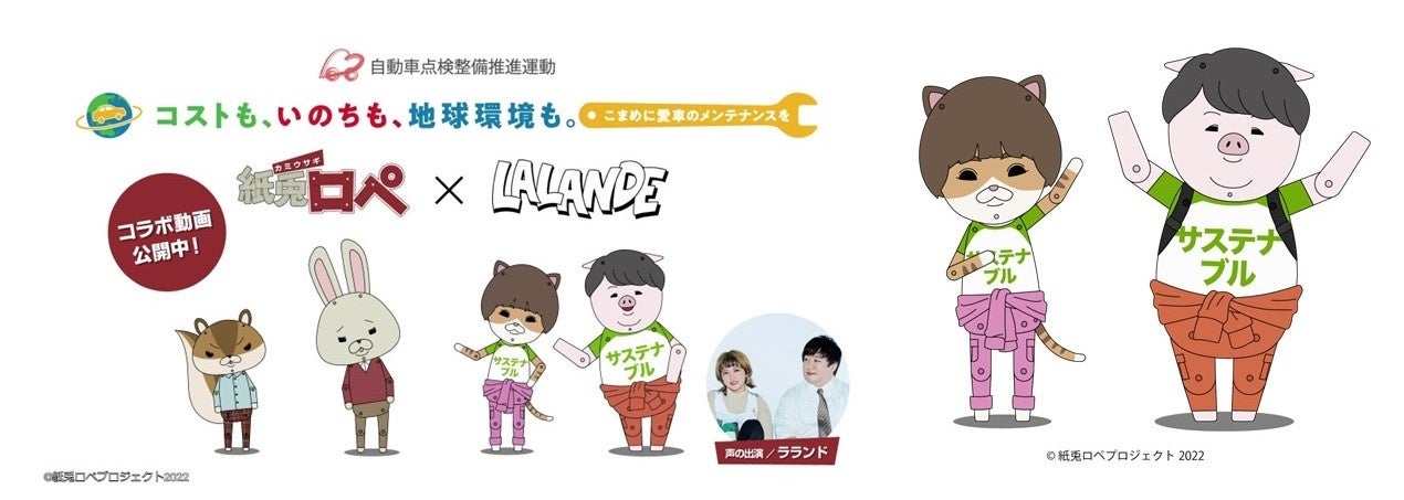 今回公開する「紙兎ロペ」とのスペシャルムービーでは、「コストも、いのちも、地球環境も。~こまめにメンテナンスを~」をキャッチコピーに、「紙兎ロペ」のキャラクターが点検整備の重要性について熱弁。点検整備が自分の安心安全を守るだけではなく、車の燃費向上やCO2の排出削減につながることを教えてくれます。また、最後には“サステナブル”とプリントされたTシャツを着て登場するお笑いコンビのラランドにも注目です。