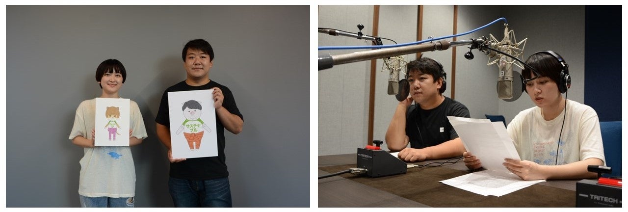 収録現場では、監督と入念に打ち合わせをしながら音声収録に取り組むラランドさんの姿が見られました。声優に挑戦するお二人は、収録が始まり、ニシダさんの芯の太い美声や、サーヤさんの特徴のある笑い声を披露すると、現場スタッフからは「上手い!」の声があがりました。お二人も自分たちの収録された音声を聞き思わず笑いがこぼれ、満足された表情でした。また、お二人に対して、監督から違うパターンの演技を求められる場面でも柔軟に対応されました。合間にはスタッフと談笑されるなど、終始笑みがこぼれる現場となりました。
