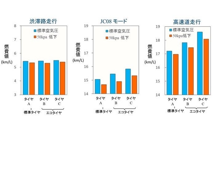 左図は、3種類のタイヤA,B,Cで、それぞれ標準空気圧状態と50kPa低下した空気圧のもとで、3種類の走行モード(渋滞路、JC08モード、高速道走行)で走行させた時の燃費を測定した結果。①の渋滞路走行では低速等の要因によりあまり差はあまり見られないものの、②のJC08モードと③の高速道走行では、タイヤの空気圧が下がった状態で燃費が明瞭に悪化。空気圧が低下した状態では、タイヤの本来のエコ性能が引き出せないことがわかりました。