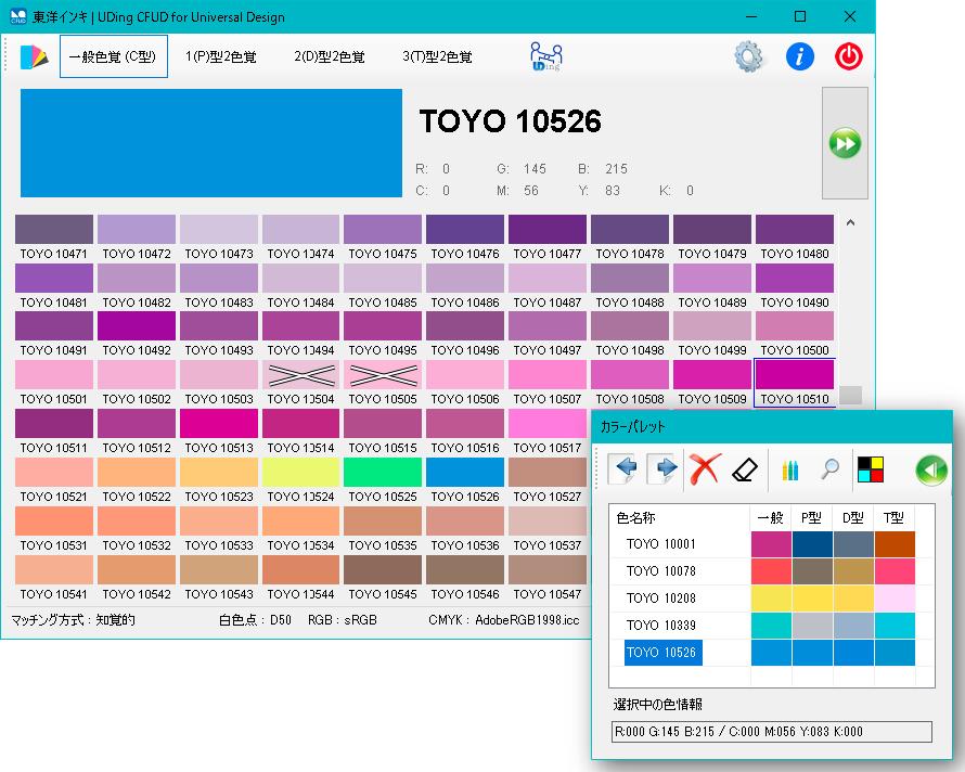 東洋インキ株式会社は東洋インキグループの中核事業会社の一つとして、印刷インキを中心に製品・サービスを提供している色の専門企業です。東洋インキのカラーマネジメントソリューションは、1997年、多様な出力デバイスで正確に色再現するためのニューラルネットワークを用いた画像色変換技術「T-Color(ティーカラー)™」に始まります。2004年には、本技術を継承したカラーユニバーサルデザイン支援ツール「UDing™」を発表。シリーズ累計で約15,000本を配布し、カラーユニバーサルデザインの普及に貢献いたしました。さらに、2018年には白内障対応カラーマネジメントソリューション「Chiarossier(キャロシエ)®」の提供を開始しました。