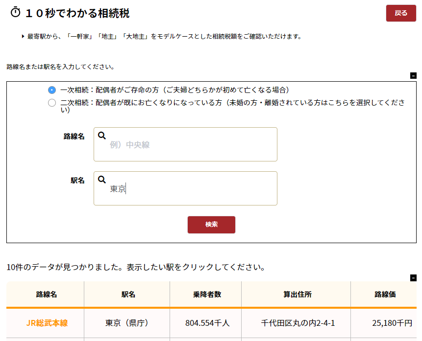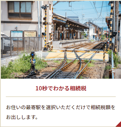 【10秒でわかる相続税】は最寄り駅を入力するだけで相続税概算がわかる画期的なサービスです。【相続のせんせい】が提供しているサービスのひとつで、「相続税は情報をいろいろと集めた上でないと計算できないので、どれくらいの相続税がかかるかが事前にわかりにくい」という相続税ならではの課題を解決いたしました。