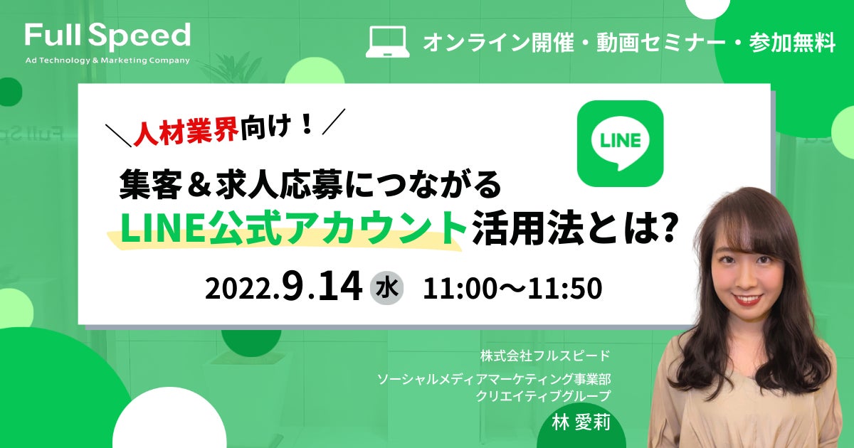 ​インターネットマーケティング支援を行う株式会社フルスピードは、「集客&求人応募につながるLINE公式アカウント活用法とは?」と題した無料オンラインセミナーを2022年9月14日(水)11時より開催いたします。