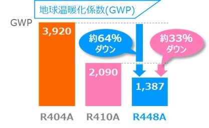R448Aは次世代冷媒ともよばれ、地球温暖化係数(GWP)が従来の冷媒R404Aと比較して約64%、R410A比では約33%低減した冷媒です。これにより、フロン排出抑制法に基づく環境影響度の目標達成度「A」を達成しました。
