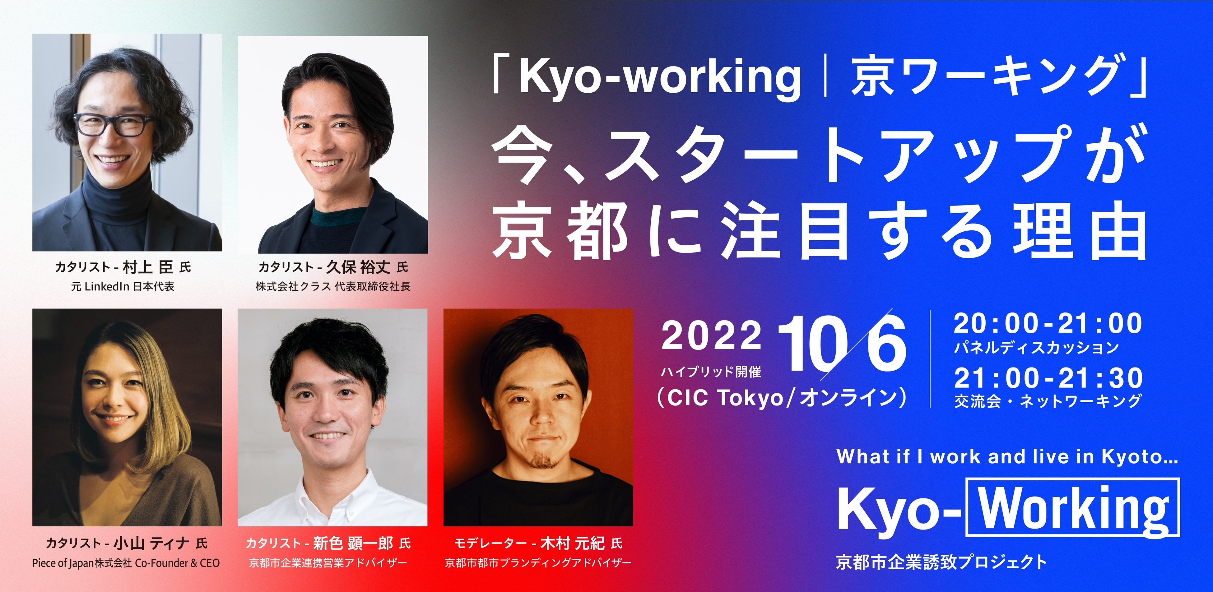 この度、その第1回目として、有識者や京都拠点を開設予定の企業などをお招きし、イノベーションを生む京都の文化的土壌やグローバル展開での優位性、「Kyo-working(京ワーキング)」という選択肢の魅力を探索いただくため、下記のとおり、トークイベントを開催しますので、お知らせします。