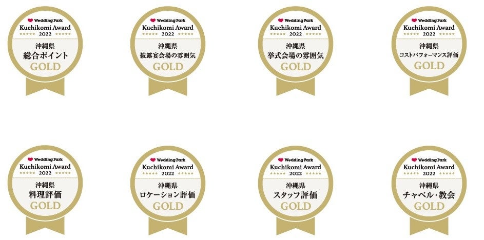 ウエディングパーククチコミアワード2022とは、結婚準備口コミ情報サイトWeddingParkが、同サイトにおける2021年1月~12月のクチコミランキングを元に発表した年間アワードで、各都道府県×ジャンルごとに最も評価の高い式場をGOLD、評価の高い式場をSILVERとして選出されています。