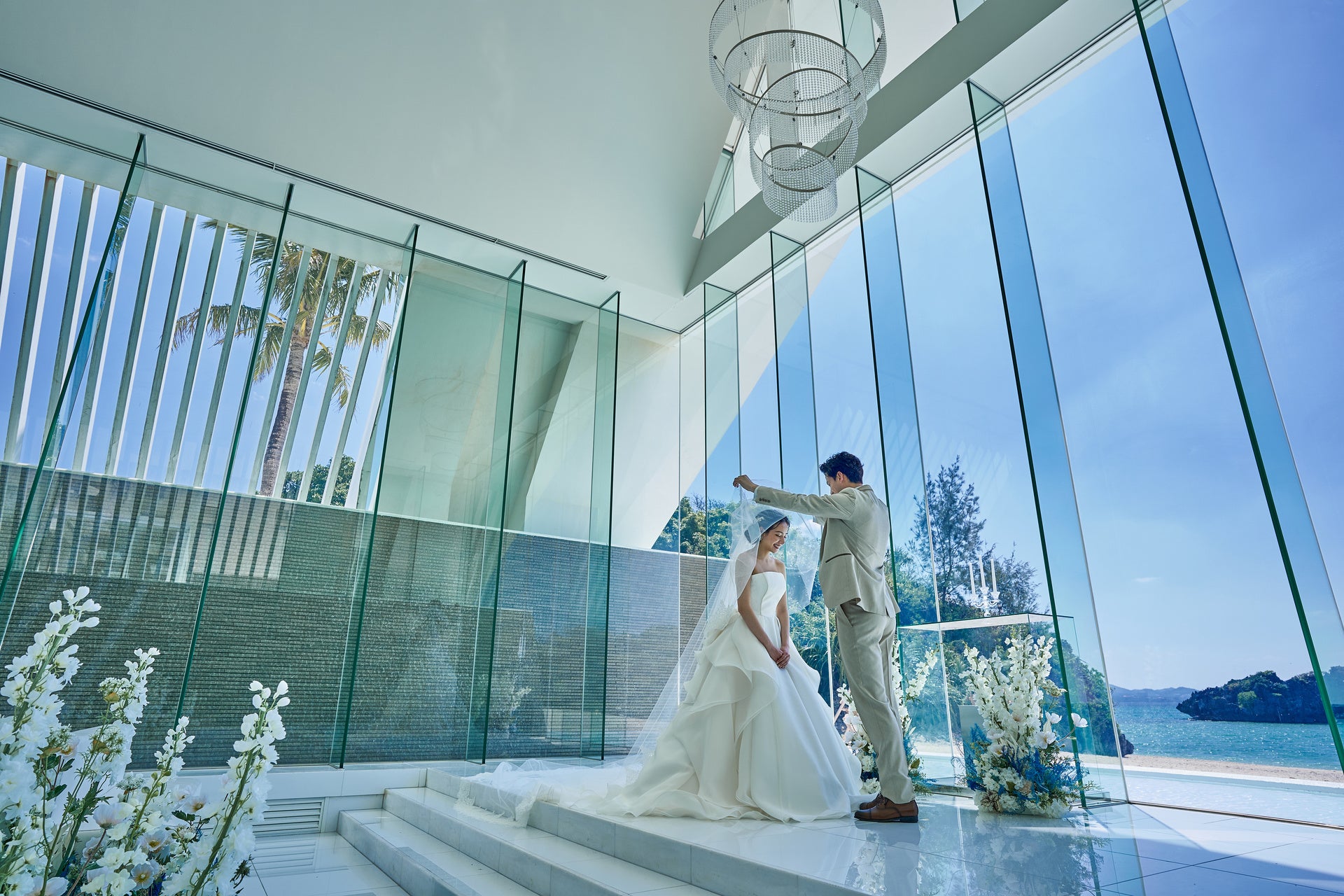 青い空、光と影、水が織りなす神秘的なチャペル。2022年7月に、祭壇から望む美しい海をより近くに感じていただきたいとの想いから、チャペル内装花をよりピュアでナチュラルなイメージにリニューアルします。