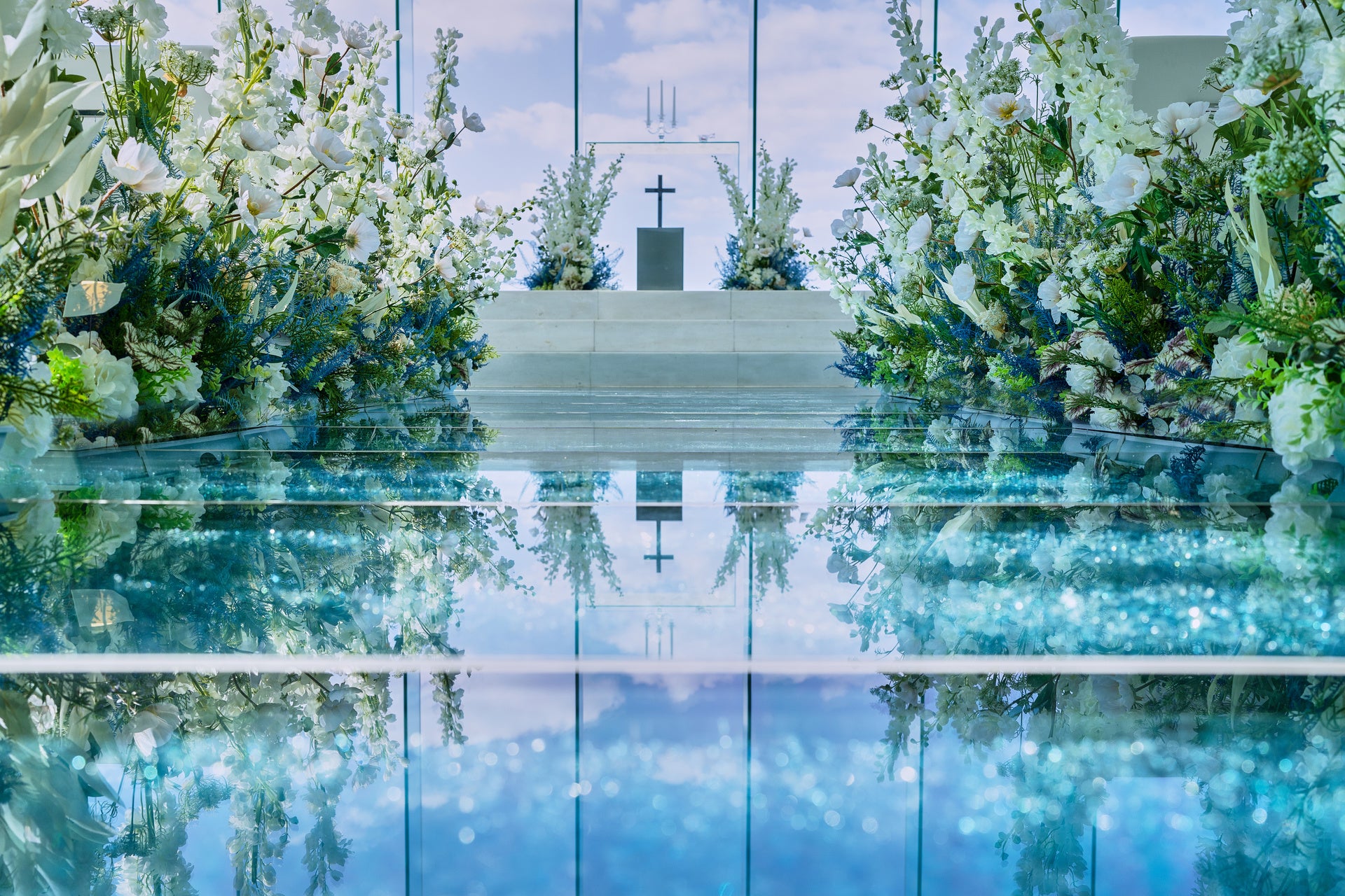 青い空、光と影、水が織りなす神秘的なチャペル。2022年7月に、祭壇から望む美しい海をより近くに感じていただきたいとの想いから、チャペル内装花をよりピュアでナチュラルなイメージにリニューアルします。