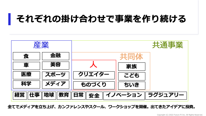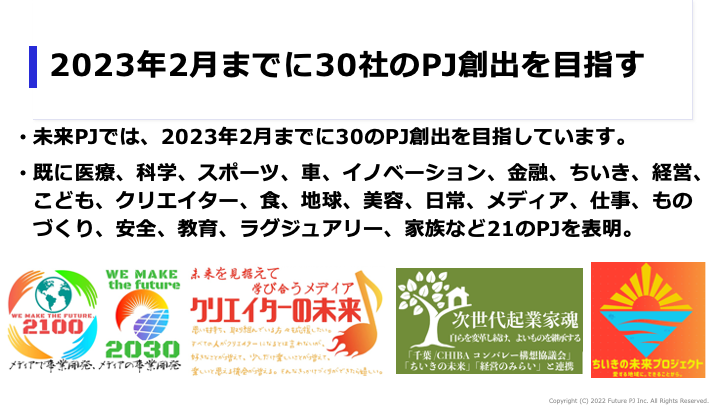 コミュニティ活動を大切にしていることもあり、未来プロジェクト同士の連携も促せるよう、統合支援する会社(https://prtimes.jp/main/html/rd/p/000000366.000018590.html)の設立も準備中です。どんな領域で立ち上げを準備中なのか、下記をご覧いただけたら幸いです。現在、2023年2月までに30社の設立を目指し、推進中です。
