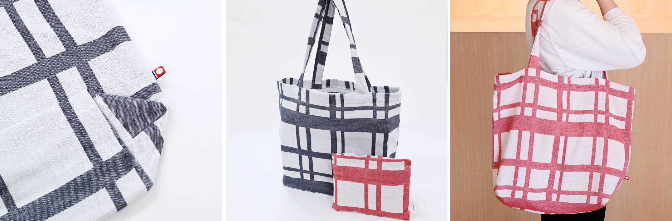 今治タオル地マイバッグ新柄「チェック」 レッドとネイビー