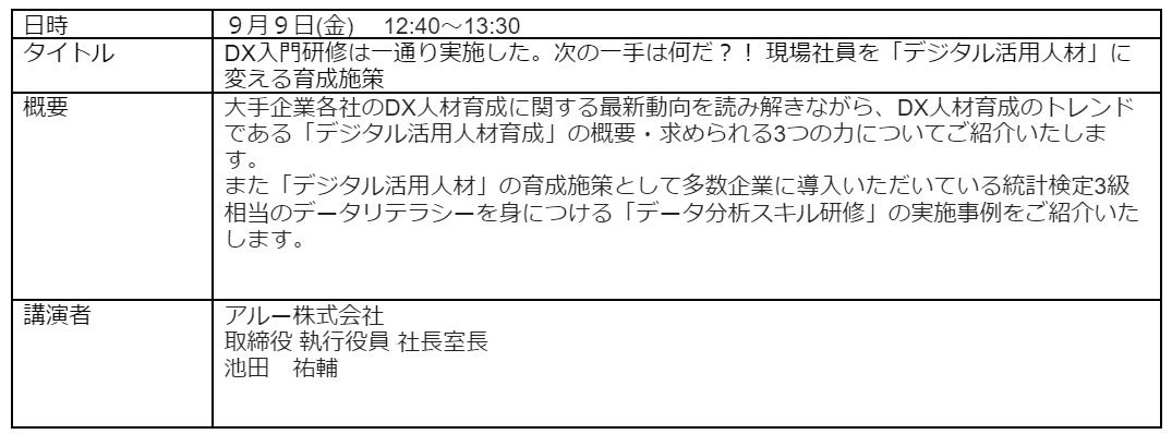 当社から、取締役執行役員 池田をはじめ、以下4名が登壇します。すべて、ストリーミング配信となっています。