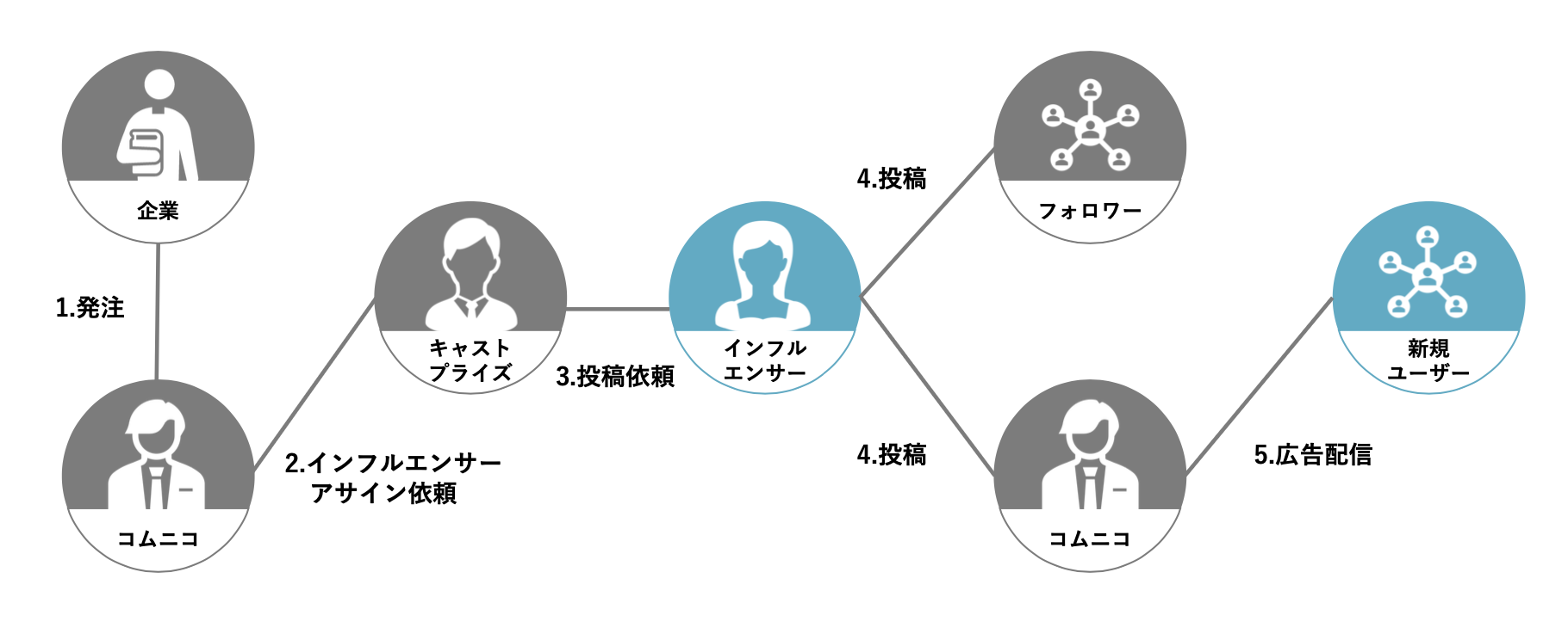 コムニコが企画立案をし、当社にてインフルエンサーの事前調査をしたうえで最適なインフルエンサーをアサインし、PR投稿後に豊富な広告配信ノウハウを持つコムニコが広告配信を行うという流れとなります。対象とするSNSは、「Instagram」「Twitter」「TikTok」をベースとし、ご相談内容に応じて「YouTube」等他の媒体にも対応いたします。※1)