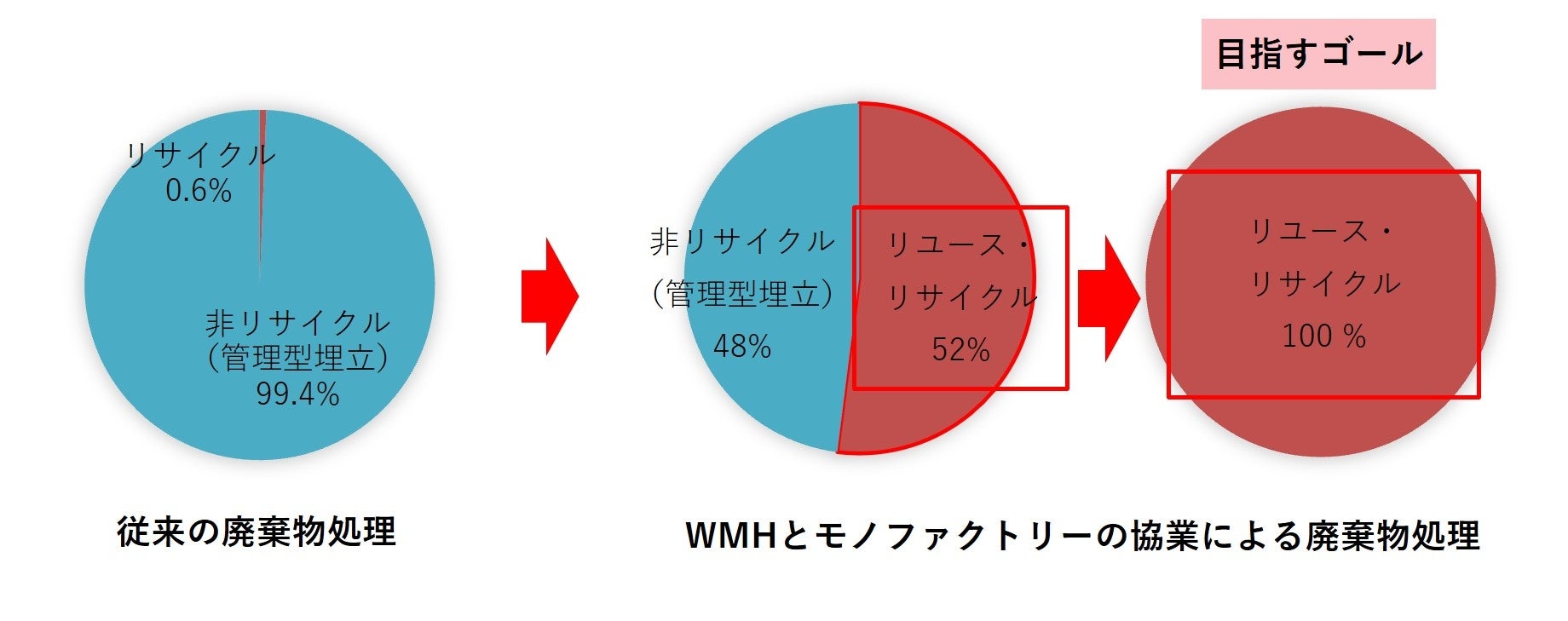 本サービスの開始に先立ち、WMHとモノファクトリーは外資ブランドのポップアップストア開催後の廃棄物リサイクルに協業で取り組みました。リユース・リサイクルを優先した選別工程を経た結果、従来の方法では0.6%(推定*)であったリサイクル率の、52.5%までの達成を実現しました。