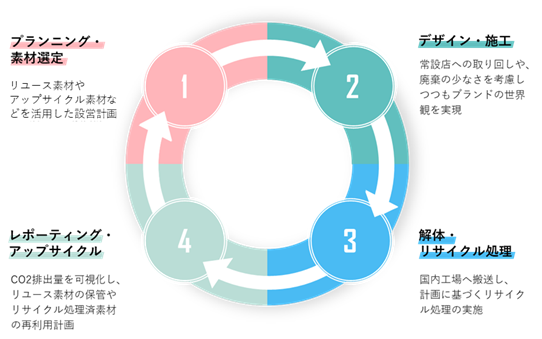 このような社会的背景を踏まえ、VMSは、店舗のメッセージ性を損なうことなく廃棄物を最小限に抑えることでCO2排出量の削減に寄与する「循環型店舗」を実現するためのサービスをモノファクトリーとともに行います。