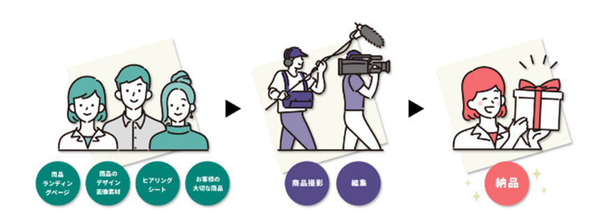 お客様にやっていただくことは、商品LP・素材・ヒアリングシートの共有と、商品発送のみ。誰でもわかりやすく、簡単な発注フローだから、お時間・お手間を取らせません。実は「動画制作がはじめて…」というお客様も大丈夫、ご安心ください。