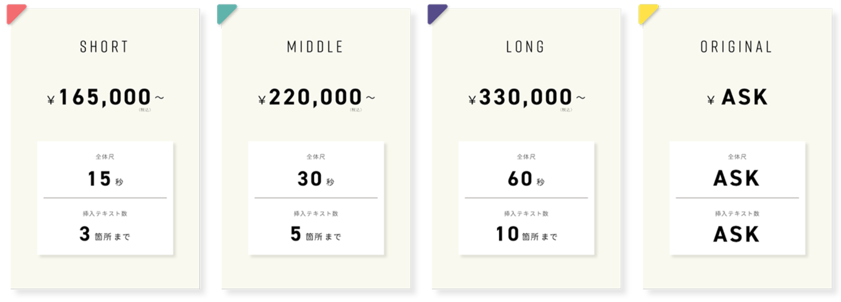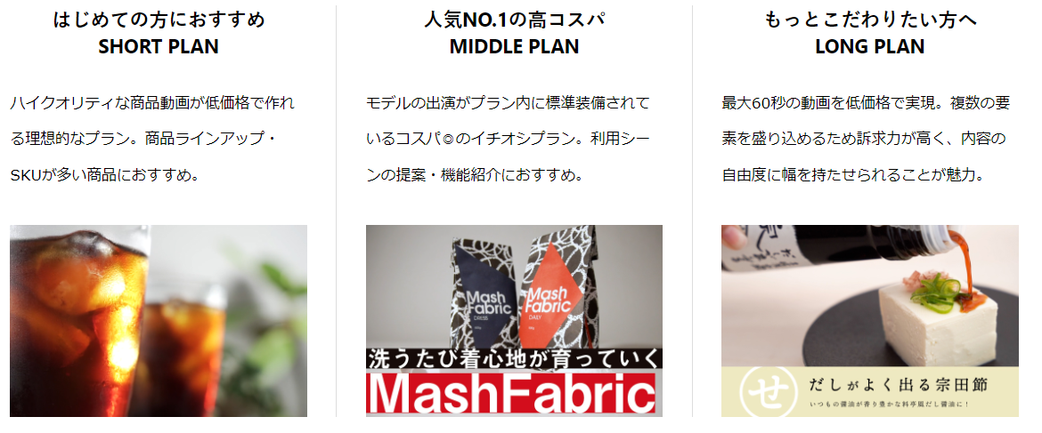 ネットショップの売上向上を図りたい、広告のための動画がほしい、イベント・店頭のサイネージで流したい。お客様の多様なリクエストに応じて、動画全体の⻑さで選べるプランをご用意しています。