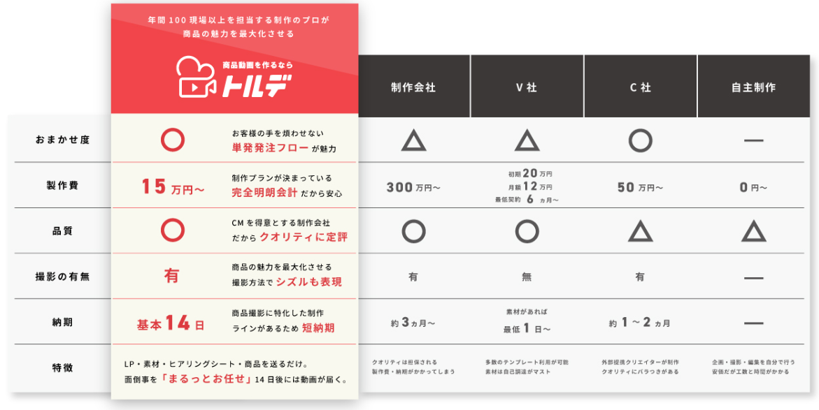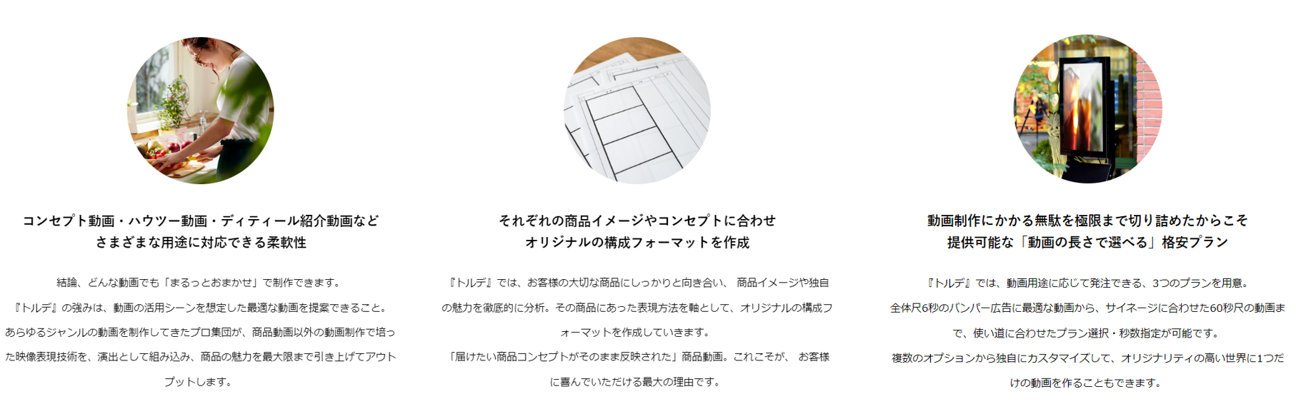 『トルデ』はクオリティが担保され、制作費を最小限に抑えつつお客様の商品の魅力を最大化するこだわりのカットを提供する「完全丸投げ型」の動画制作サービスとしてリニューアルをいたしました。