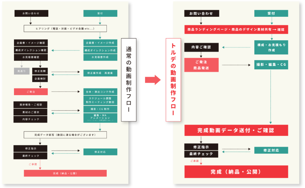通常の動画制作は、お客様と制作会社のコミュニケーションに相当な時間をかけ「すり合わせ」をおこなうのが一般的。どの制作会社も「商品動画をつくる」という目的が明確であっても、通常通りのフローで制作をしています。これでは関係会社が多段階的に介入し、納品まで時間がかかるだけでなく、制作費がどうしても高くなってしまいます。