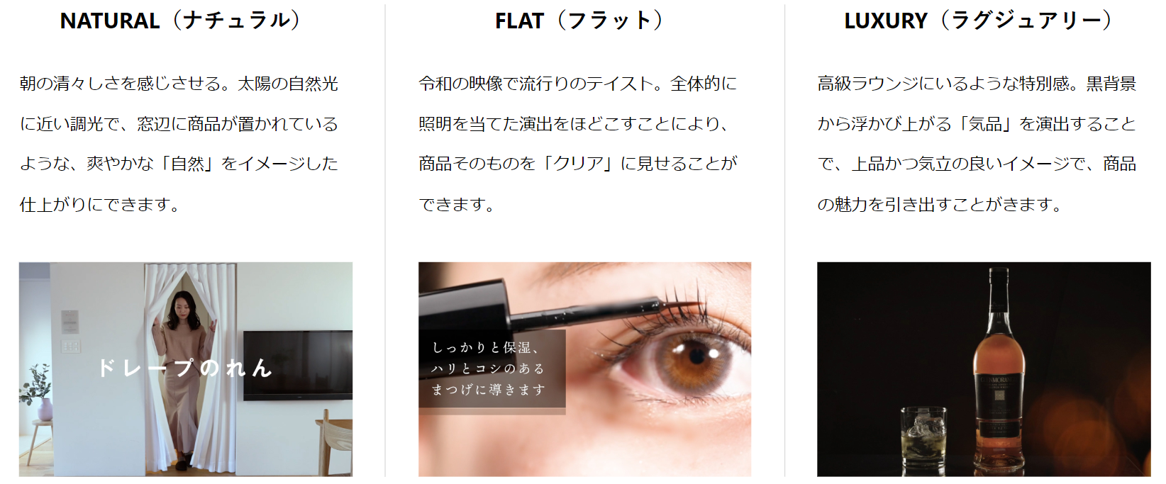 お客様の大切な商品。そのイメージに合わせ、大きく3つの作風をご用意しています。