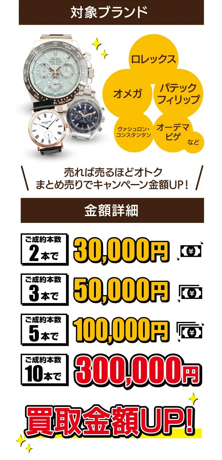 対象ブランドはロレックスを含めてオメガ、パテックフィリップ、ヴァシュロン・コンスタンタン、オーデマピゲなどです。こちらは10本以上で最大30万円の買取金額UPとさせていただいており、お客様には相対的に買取金額の高い方のキャンペーンを適用いたします。
