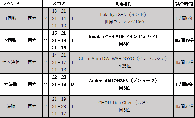 1回戦で同10位のインド選手、2回戦で同8位のインドネシア選手を相手に、いずれも第1ゲームを先取されながらフルセットで勝利。準決勝では、世界選手権でも金星を挙げた同3位のデンマーク選手をストレートで倒しました。