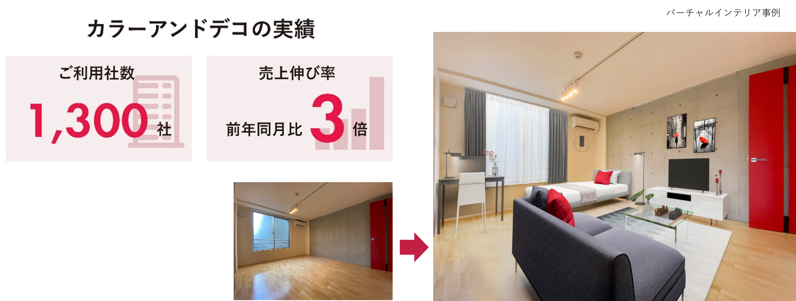 サービスローンチ後、1,300社以上の不動産会社にご利用いただいております。不動産広告掲載の物件写真をバーチャルインテリア写真に変えるだけで問い合わせ数が120%アップした事例、バーチャルシミュレーターで半年空室の物件が4日で成約になった事例など、暮らしのイメージを加える不動産ビジュアルマーケティングの重要性を感じていただいております。