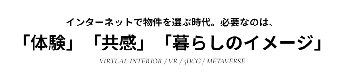 私たちは、空室写真で募集掲載されている日本の不動産業界の文化を変える為、バーチャルでインテリアを設えるバーチャルインテリアや、不動産に特化したVR・メタバースを提供しております。空室(箱)ではなく、インテリアが設えられ初めて消費者の方は、どんな暮らしができるのかイメージを湧かせることができます。しかし、まだまだ空室(箱)写真をそのまま掲載している不動産会社がほとんどです。